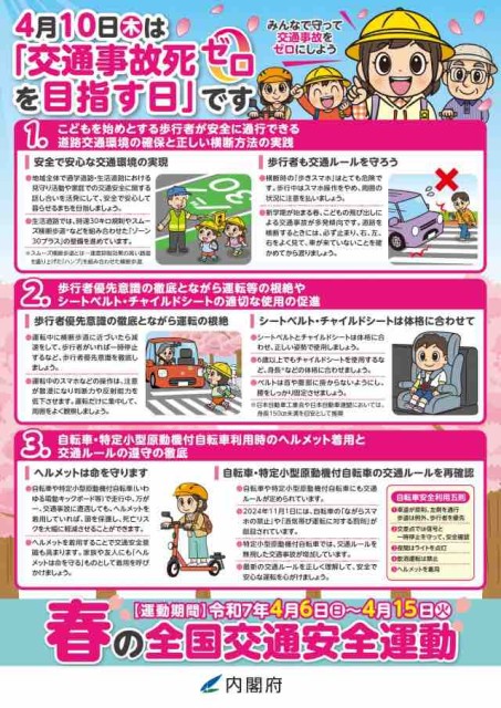 さて、4月6日から4月15日の10日間、春の全国交通安全運動が実施中で、4月10日は「交通事故死ゼロを目指す日」となっています。